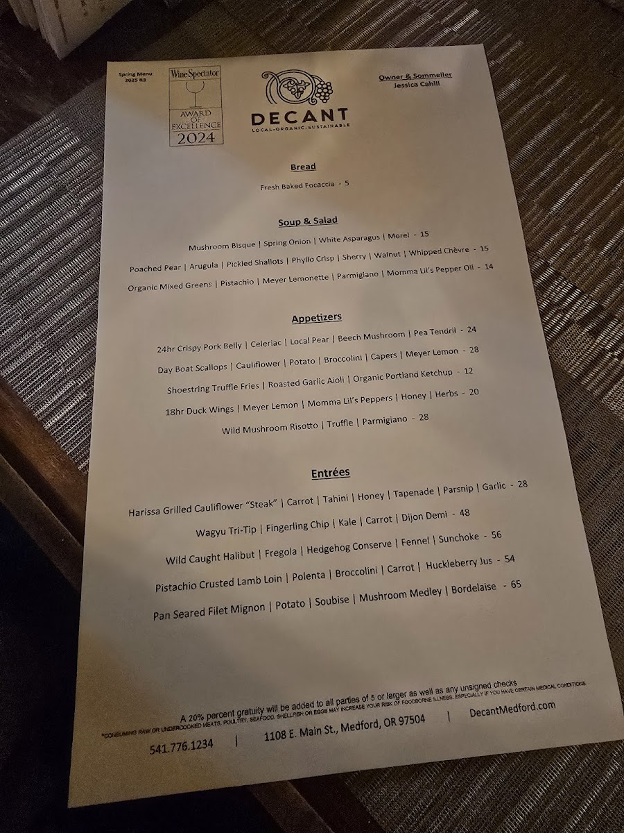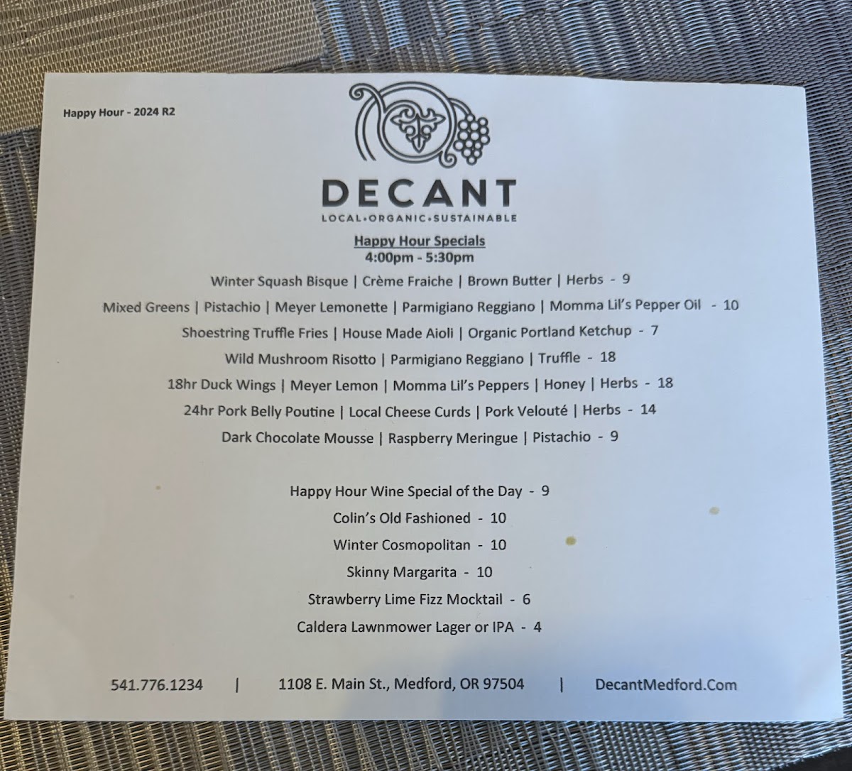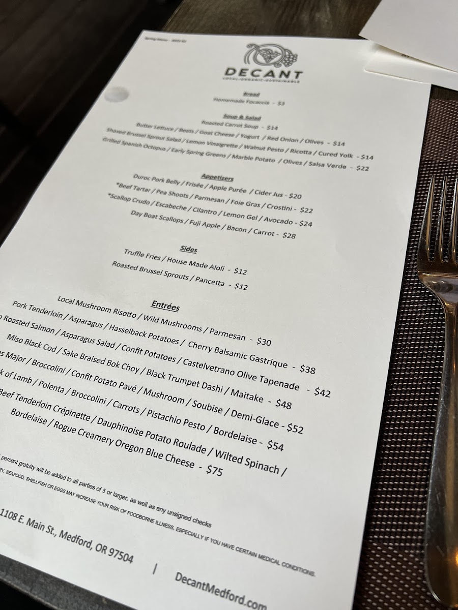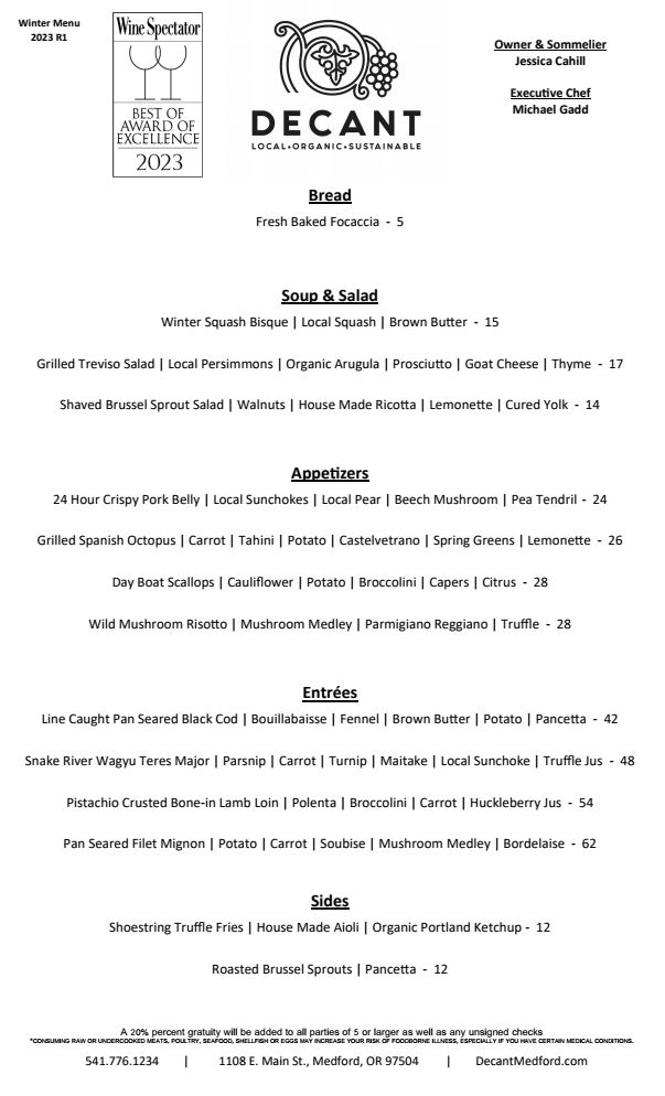 Welcome to Decant, a culinary gem nestled in the heart of Medford, Oregon. Known for its innovative menu and exceptional service, Decant invites you to indulge in a dining experience that transcends the ordinary. The carefully crafted dishes shine with creativity and balance, making each plate a work of art. Highlights include the deeply satisfying winter squash soup and the fulfilling Tri Tip, each reflecting the chef's commitment to quality and flavor.