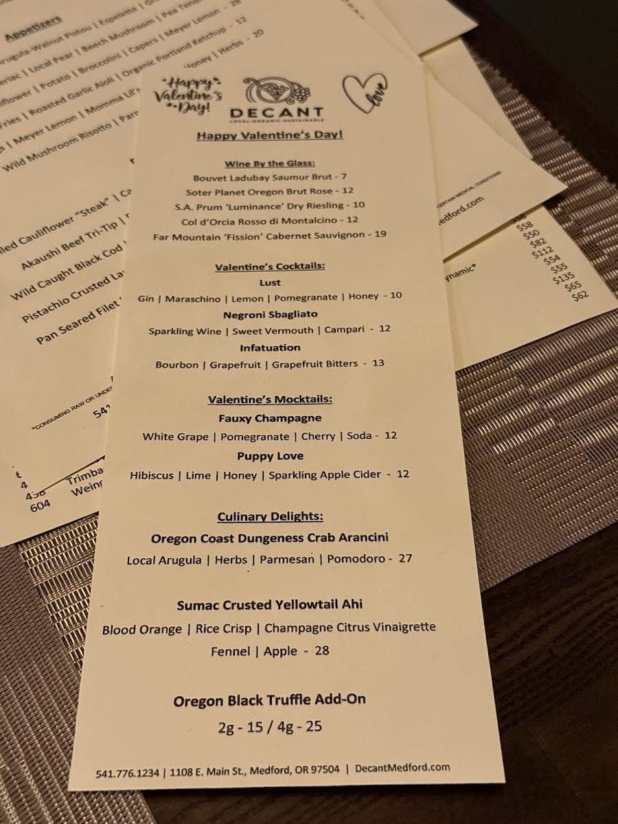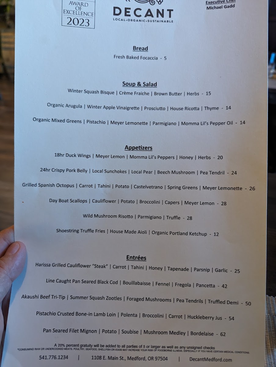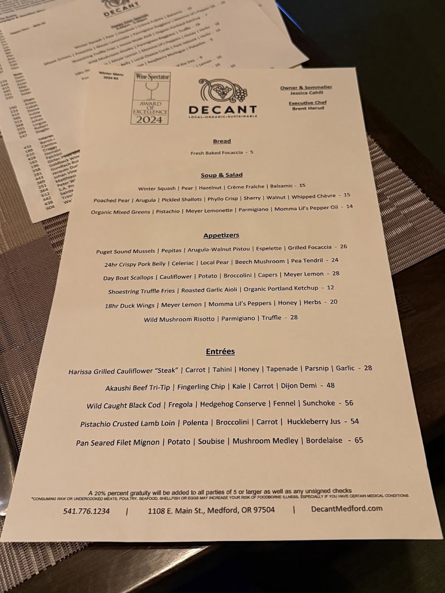 Welcome to Decant, a culinary gem nestled in the heart of Medford, Oregon. Known for its innovative menu and exceptional service, Decant invites you to indulge in a dining experience that transcends the ordinary. The carefully crafted dishes shine with creativity and balance, making each plate a work of art. Highlights include the deeply satisfying winter squash soup and the fulfilling Tri Tip, each reflecting the chef's commitment to quality and flavor.